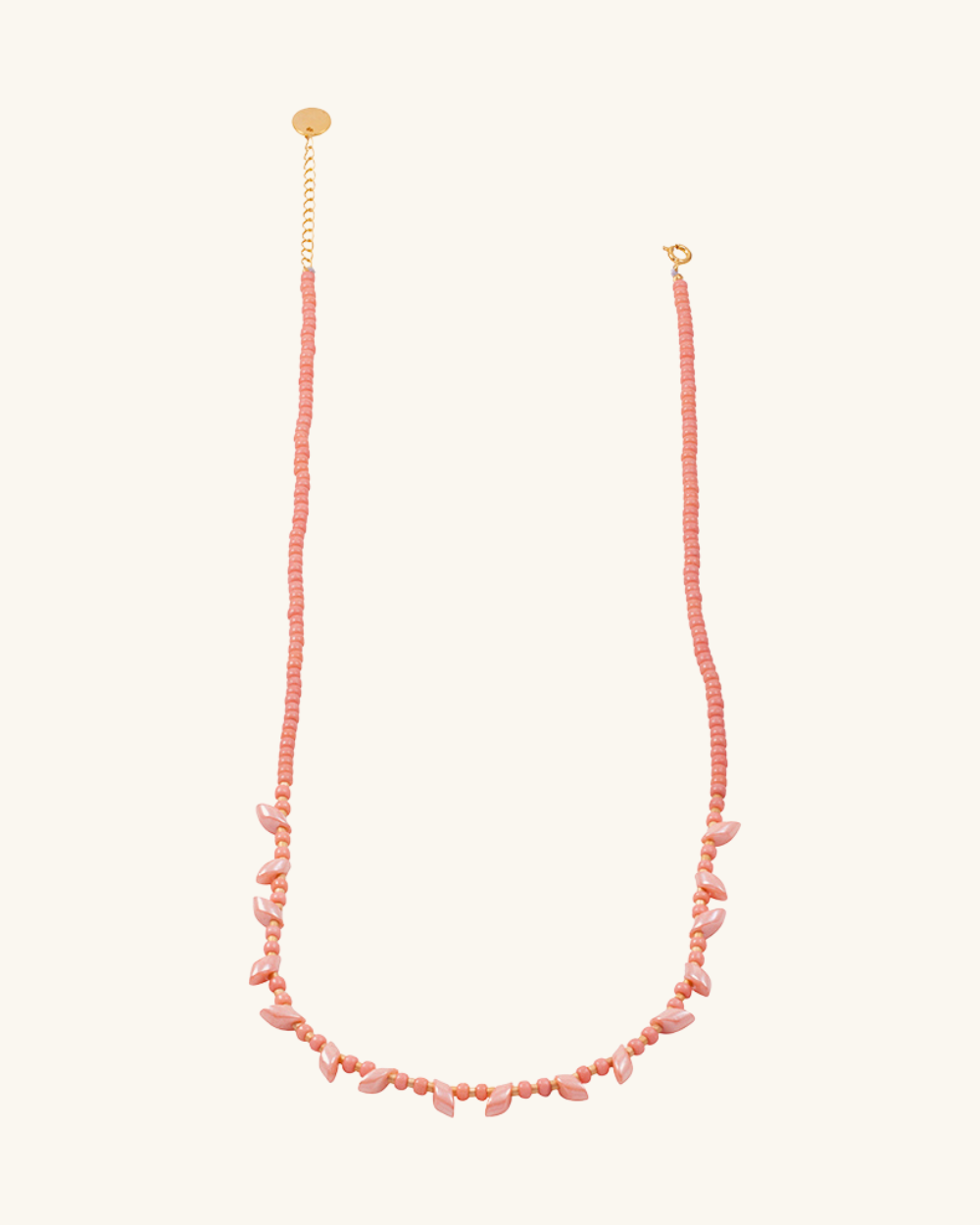 Un choker de mostacillas rosadas con toques nacarados que le da un toque diferente a tu estilo.